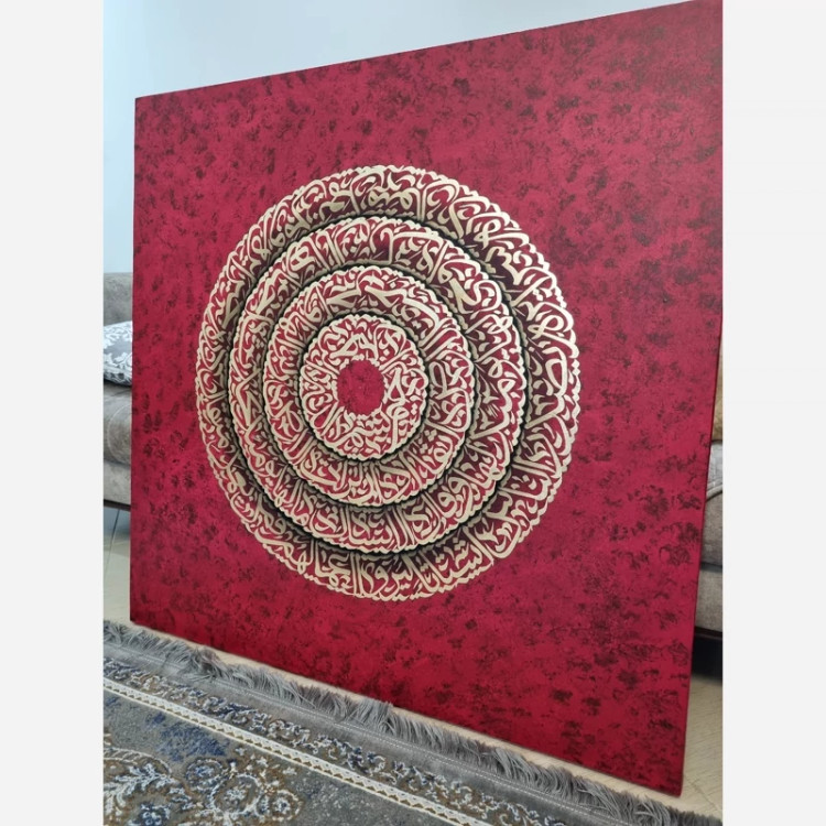 تابلو کالیگرافی اجرا شده با ورق طلا مزین به صوره مبارکه زلزال ابعاد 1*1 زمینه کار به رنگ قرمز پتینه شده اجرا شده